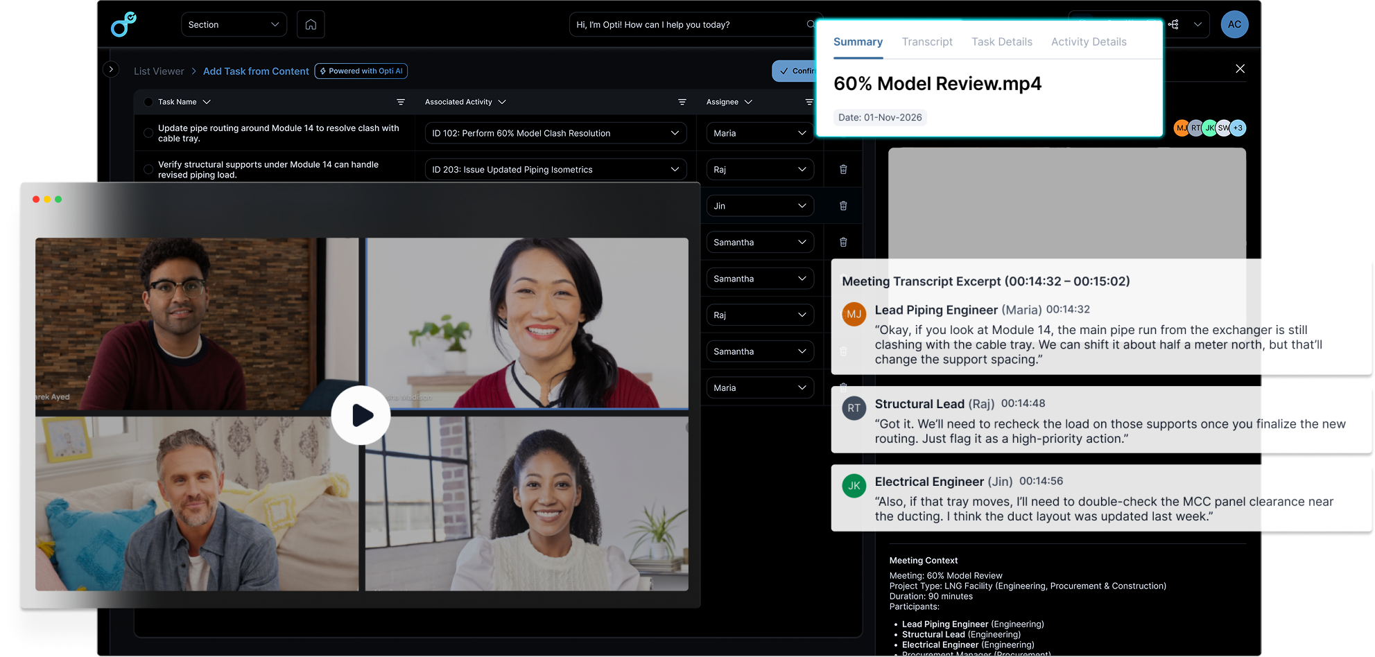 • AI Optimizers: Purpose-built AI agents for deliverable change detection, transcript-to-task automation, daily execution briefings, and process intelligence
