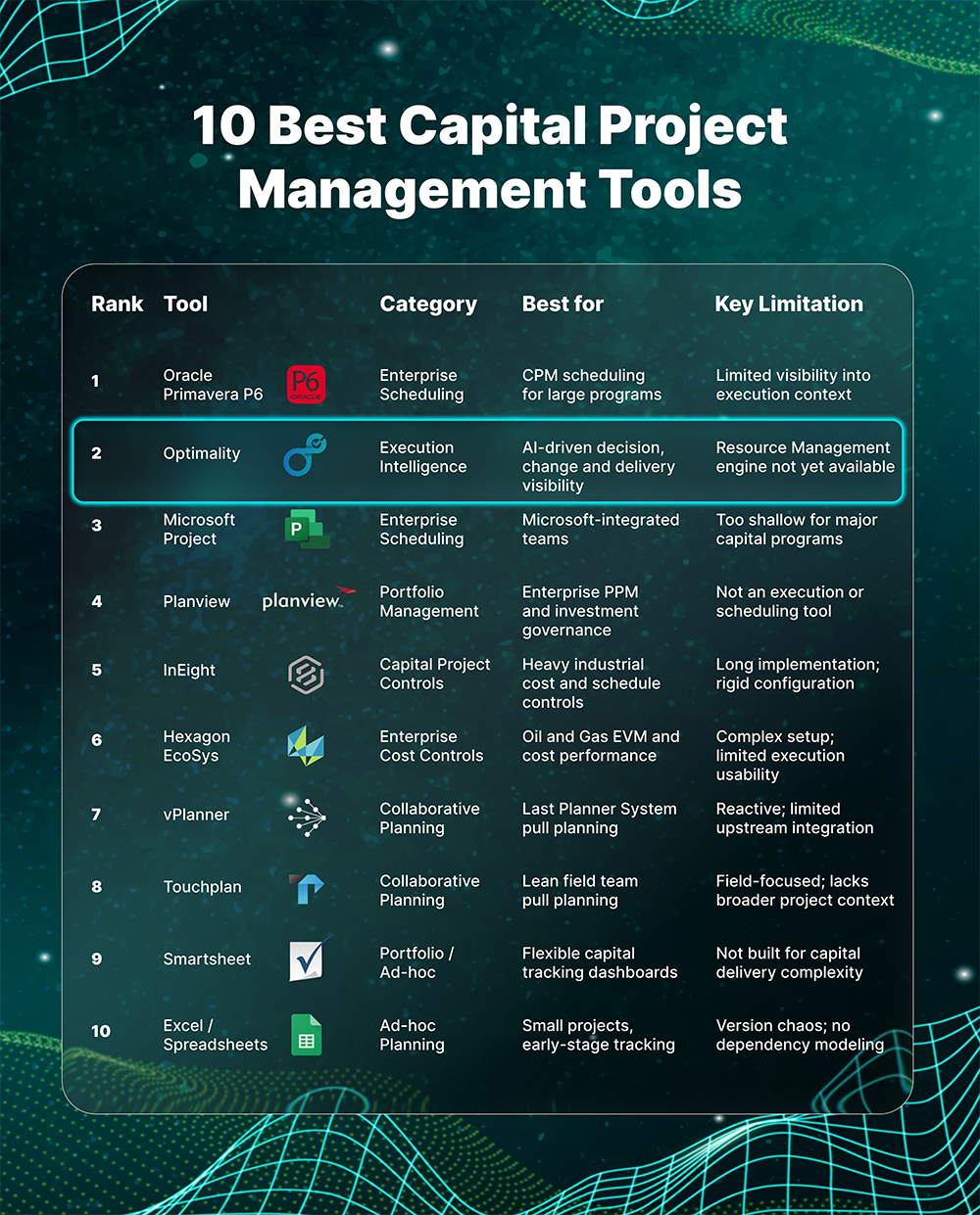 One of the fastest-growing segments of capital project software is tools that model how work actually flows-not just how it was planned. Platforms like Optimality help define a new category above scheduling and pull planning: execution intelligence. This reflects a broader shift from reactive project tracking toward more proactive, decision-oriented systems that surface risk before it impacts delivery.